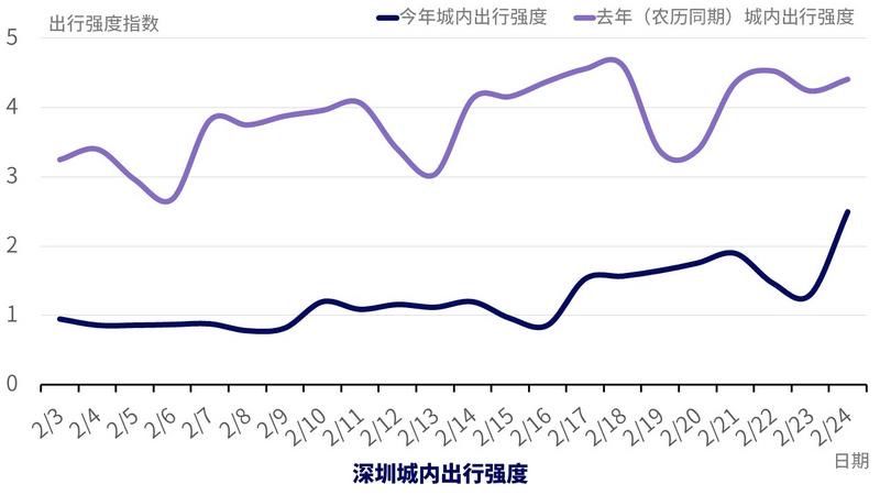 人员的迁入,复工的进行时,让深圳久违的早高峰再次出现,2月24日,深圳早高峰时段出行车辆42.09万辆,较上一周上升58%,城内出行强度达去年农历同期的56.7%。