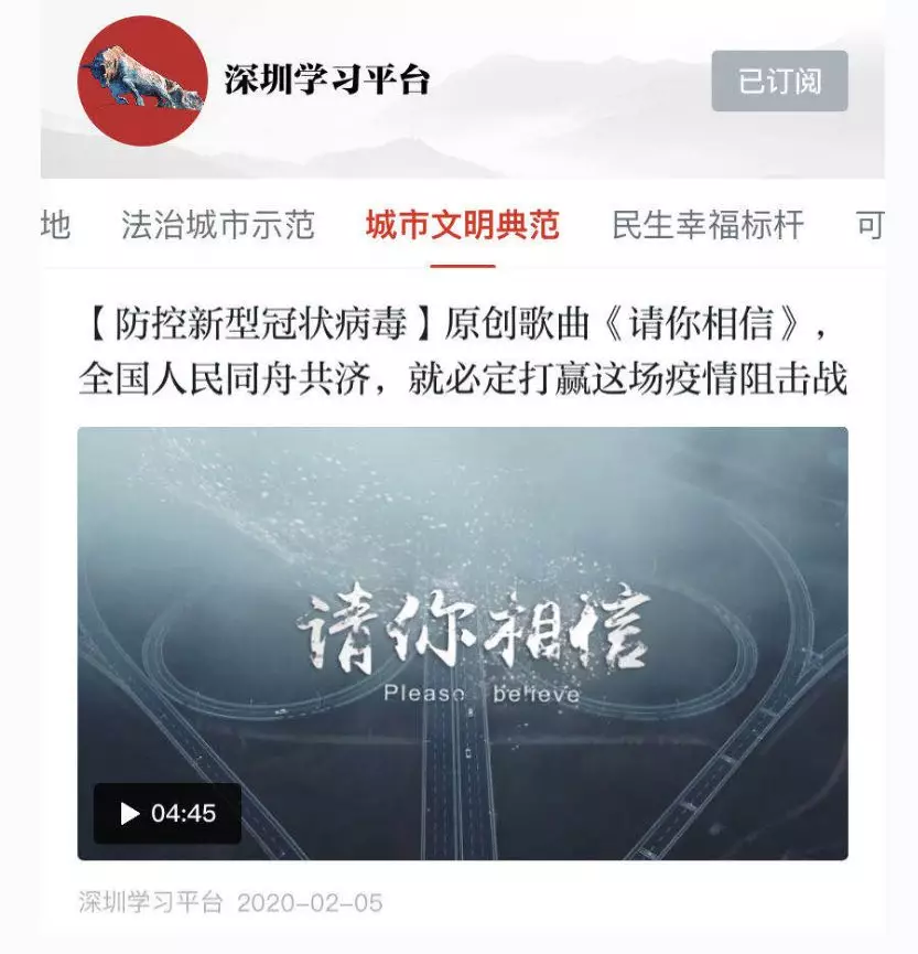 在深圳市委宣传部的统一部署下,深圳的创作者们在短时间内创作出众多暖人心、聚力量的作品,《请你相信》是首批推出的作品之一。2月5日,《原创歌曲<请你相信>,全国人民同舟共济,就必定打赢这场疫情阻击战》视频登上“学习强国”全国平台“推荐”栏目,在朋友圈广为传播,反响良好。