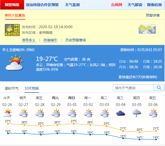 见圳客户端·深圳新闻网2020年2月26日讯 市气象局消息,深圳26日多云间晴天,早晚有轻雾或雾,气温19-27℃,东风2-3级,相对湿度55%-90%;2月27日至3月3日多云为主,白天天气温暖,早晚有轻雾,27日东部沿海和海区有6-7级阵风。