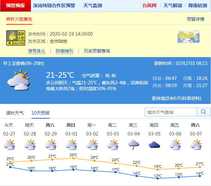 27日多云,早晨有轻雾,气温18-25℃,沿海及高地最大阵风6-7级;28日至3月3日多云为主,气温小幅波动,早晚有轻雾,偶有零星小雨;4日冷空气影响,北风加大,有小雨,气温明显下降。森林火险黄色预警持续生效中,请注意家庭用火、用电安全。