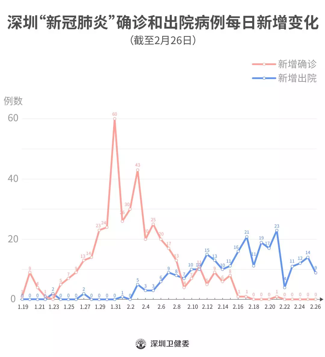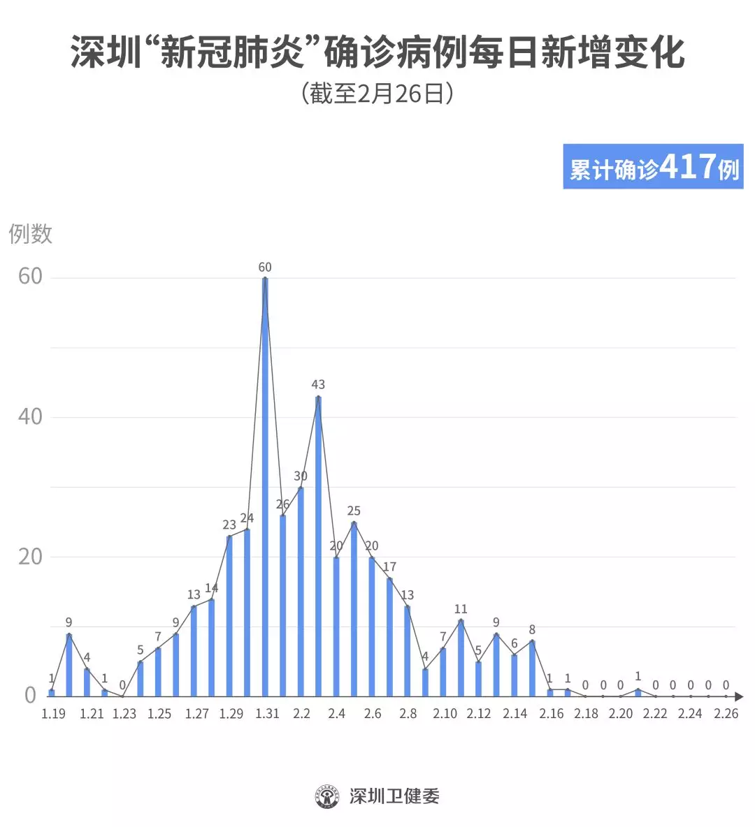 截至2月26日24时,深圳累计报告“新冠肺炎”确诊病例417例。2月26日当天全市无新增确诊病例,当天出院病例9例(从26日起不再公布出院个案)。