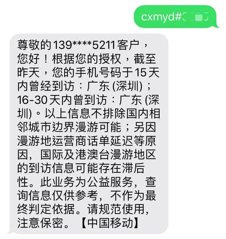 编辑短信CXMYD#身份证号码后四位到10001,授权回复Y后,实现“漫游地查询”,可查询手机号近15日内的途径地信息。