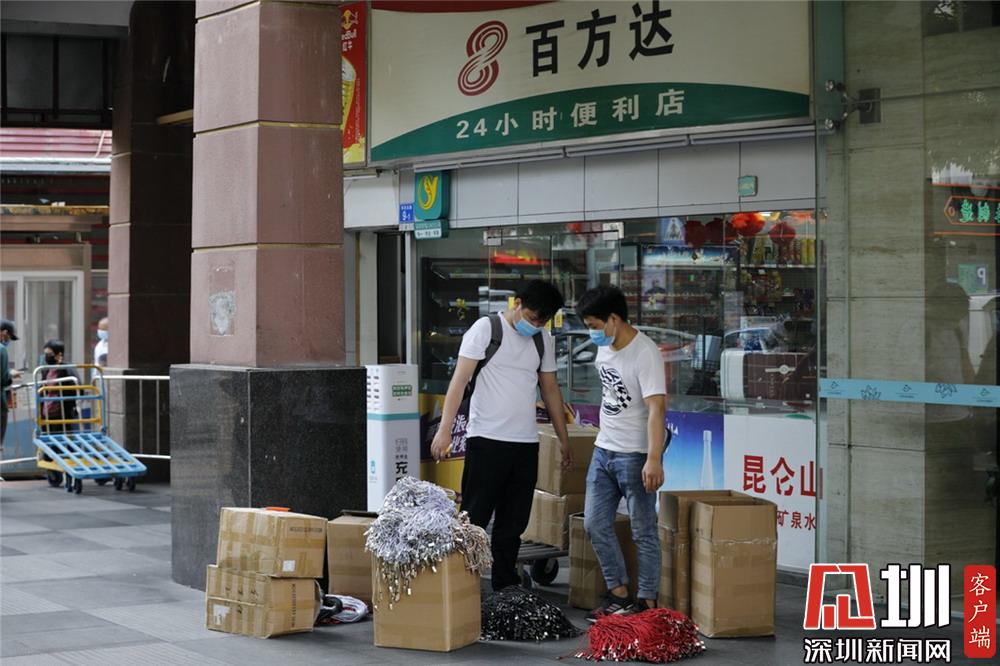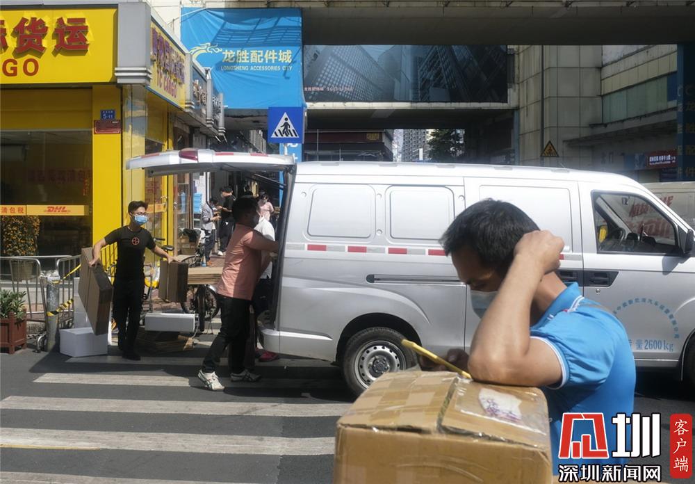 华强北龙胜配件城附近,搬运货物的人均有佩戴口罩。