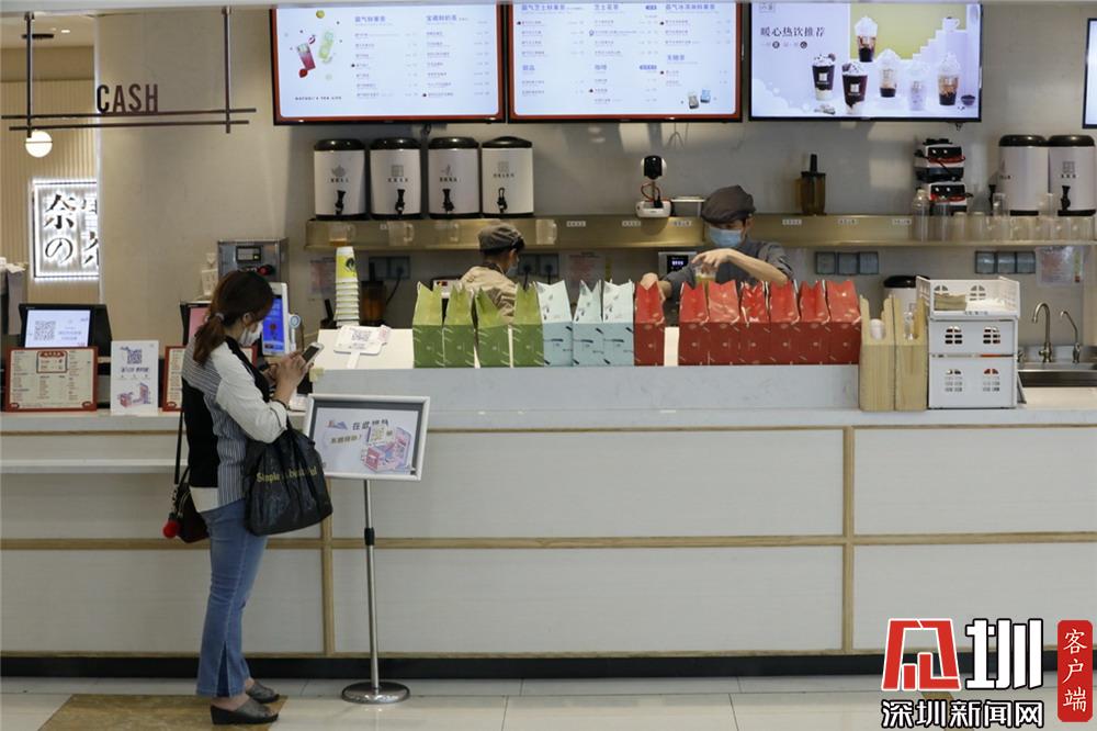 一个饮品店前,等待取餐的市民以及店员都有佩戴口罩。