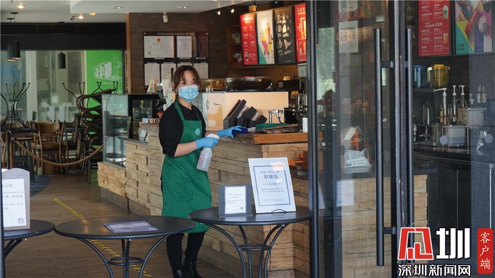 咖啡馆都采用门口取餐带走的销售模式,图为正在进行消毒情节的员工。