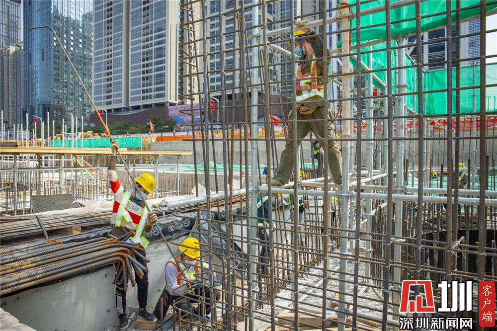 岗厦北地铁施工工地,工人们佩戴好口罩进行施工。