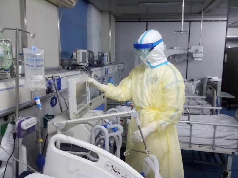 吃完和三病区主任一路到了隔离病房门口,气氛突然就凝重起来。脱衣服、洗手、穿防护服,护士严格监督每个步骤,口罩、隔离衣帽子不能留一点缝隙。我也有些紧张,生怕有什么地方没做好出现暴露,也不知道推开那扇沉重神秘的大门后会是什么样子?