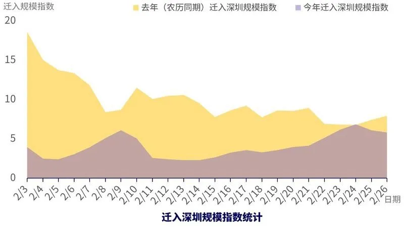 年前,深圳人口达2000万人,春节期间最低830多万人。从百度地图迁徙-春运期间迁入深圳趋势可以看到,相比去年,年后迁入深圳规模较去年一直呈现平稳的低态势,但在2月9日呈现出一波返程小高峰,2月14日,在深人数约1300万人,目前约1600万人,也就是说年后至今约有七百多万人从外地返回深圳。