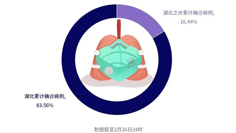 截至2月26日24时,全国累计确诊病例78497例,其中,湖北地区占比83.56%。