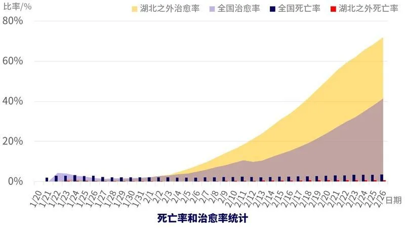 治愈率远超死亡率。截至2月26日,非湖北地区治愈率已达72%,死亡率为0.8%。全国治愈率也在不断提升,与死亡率之间的距离快速拉大,2月26日,全国治愈率41.4%,死亡率3.5%。