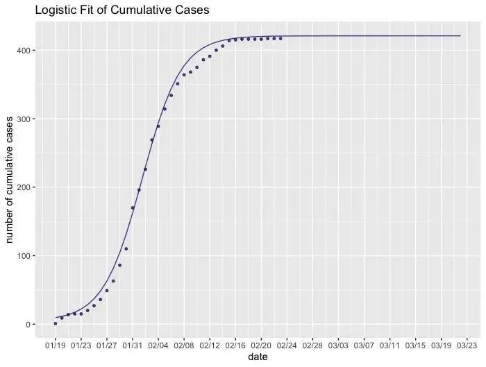 进一步地拟合深圳新冠肺炎的累计确诊人数,并对累计确诊人数做出预测。可以看到,模型预测自2月28日起病例数不再增加,预测得到最终的累计确诊人数收敛在422人左右。