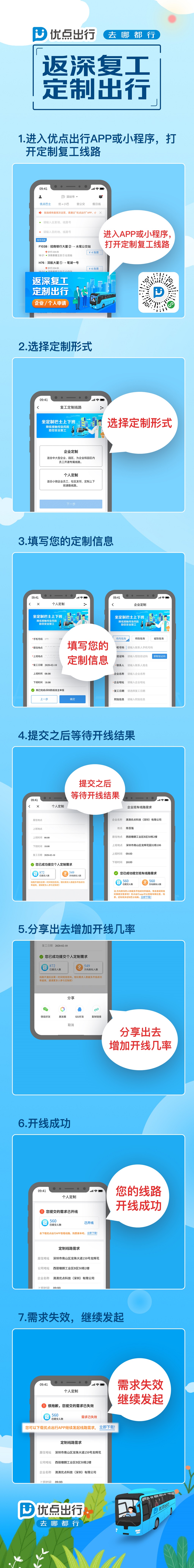 复工企业和个人在“优点出行”APP或“优点巴士”小程序中提交申请、填写复工出行需求,由优点出行平台聚合生成复工专线并通知乘客,深圳巴士集团提供安全消毒的车辆进行乘客运输。