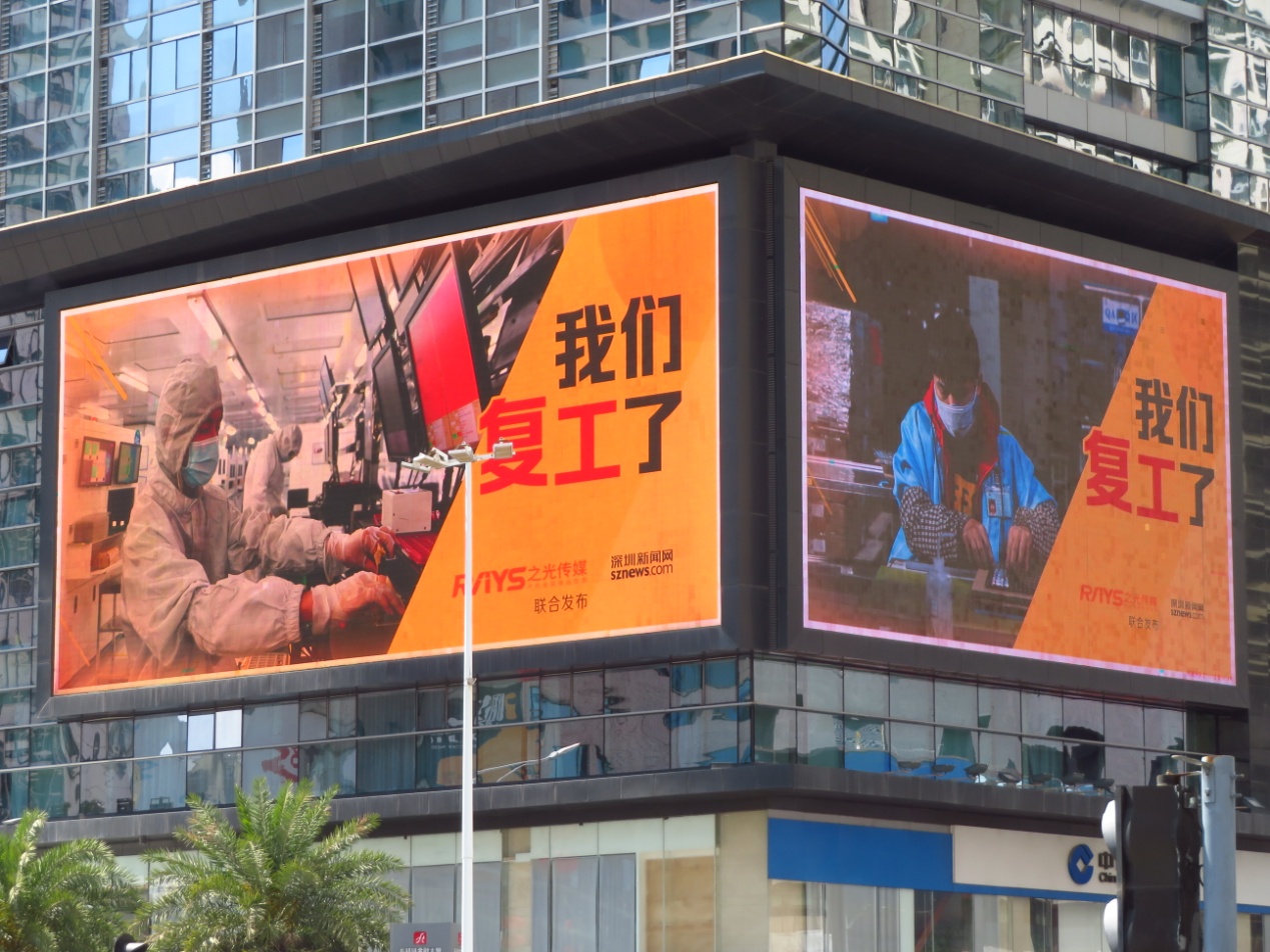 2月以来,深圳新闻网联合之光传媒在17块户外LED大屏广告上刊登了多组不同主题的公益广告,包括“加油中国”、“向逆行者致敬”、“瞒报就是犯罪”系列警示标语、“我们复工了”等。这些户外大屏遍布全市各主干道和核心商圈,总面积达6000㎡,市场价值约1200万元。