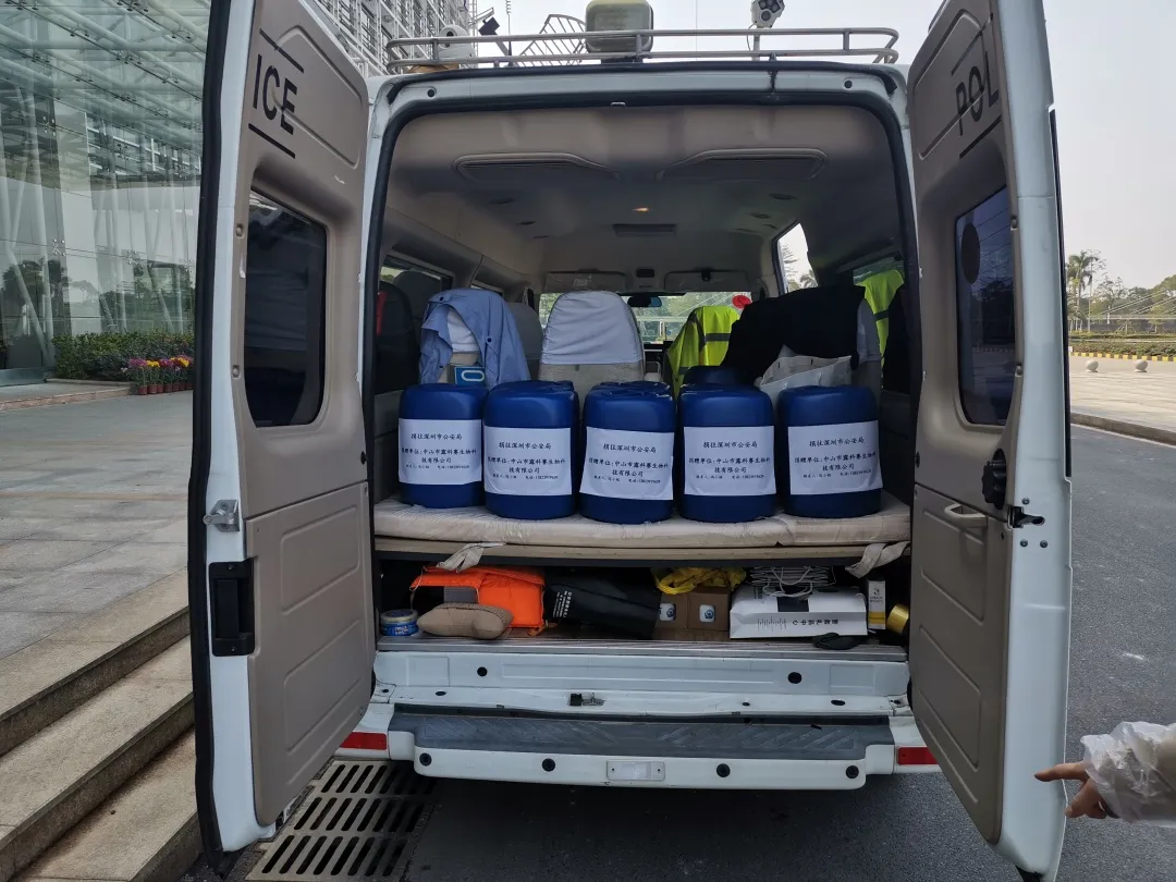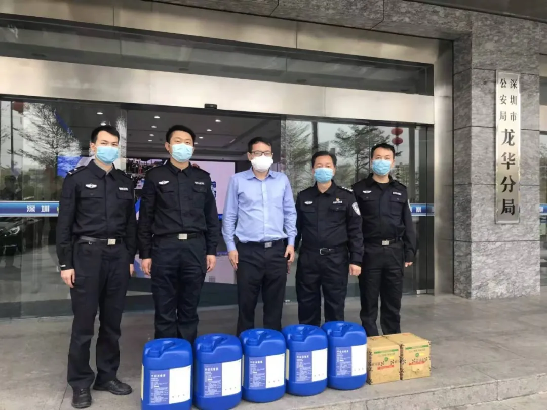 在疫情期间,这并不是他们第一次捐赠。早在1月31日,慈善小团队就给龙华公安分局、龙华街道办事处、龙华区网格办等几个部门送去了价值约8万元的消毒水。之后,又陆陆续续向深圳市公安局捐赠12桶消毒原液,向龙华公安分局捐赠了7桶消毒水,向社区捐赠医用口罩1000个、5桶消毒水、20瓶300毫升消毒水,向龙华区人民医院捐赠