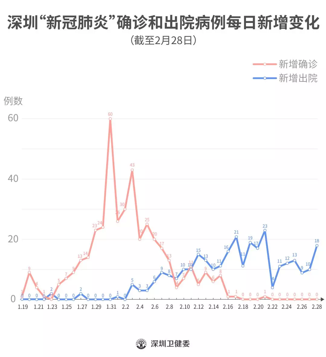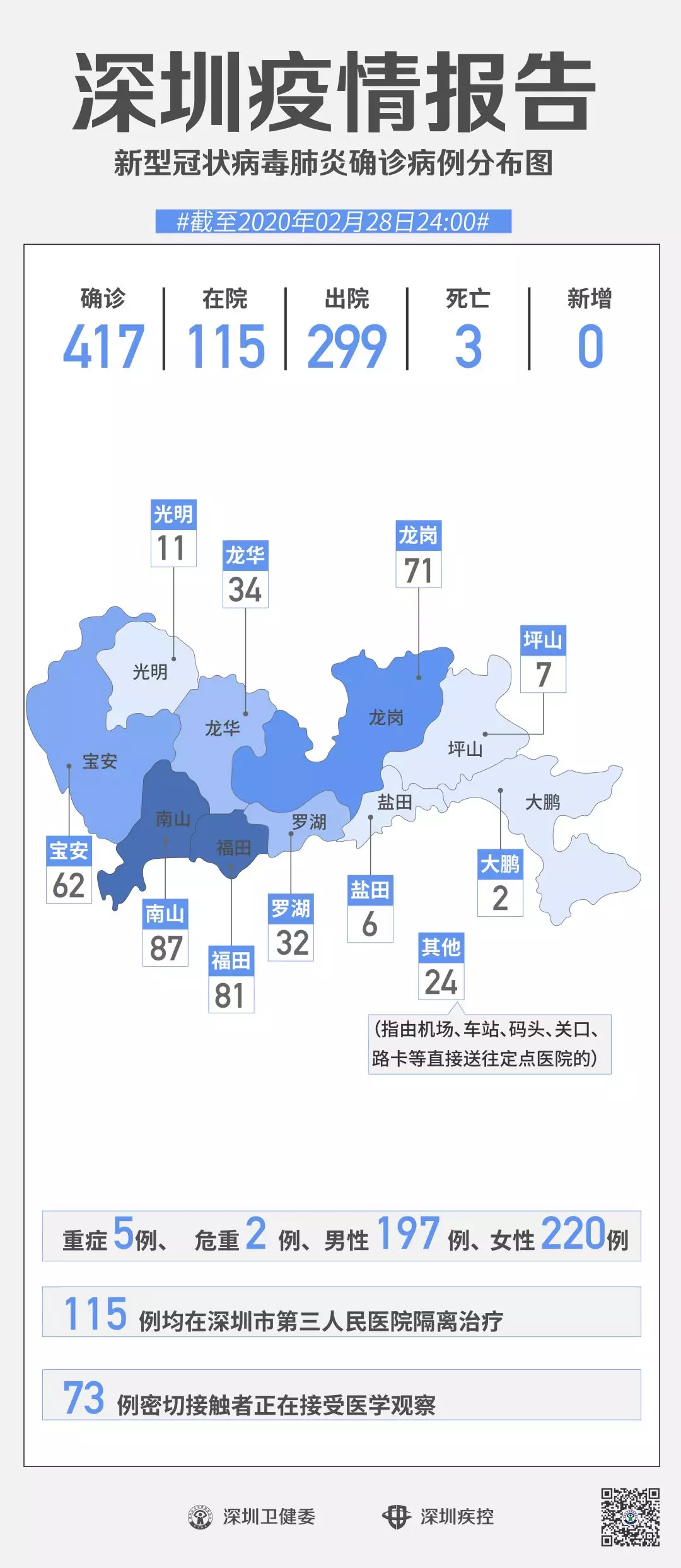 截至2月28日24时,深圳累计报告“新冠肺炎”确诊病例417例。2月28日当天全市无新增确诊病例,当天出院病例18例(从26日起不再公布出院个案)。