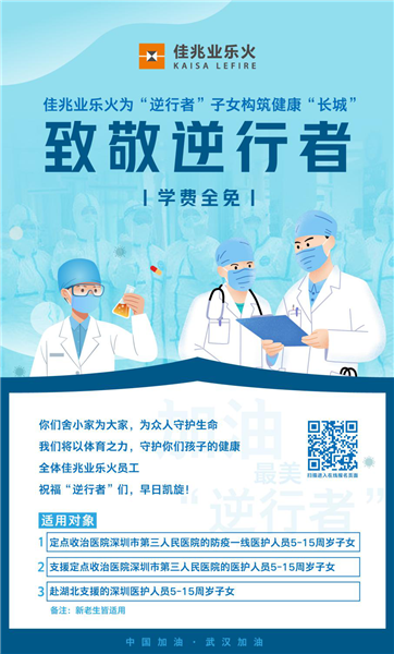 见圳客户端·深圳新闻网2月29日讯(见圳客户端、深圳新闻网记者 李云云 通讯员 张慧)突如其来的新冠肺炎疫情牵动着人们的心,在这场没有硝烟的战斗中,广大医护人员舍小家为大家,日夜冲锋守护在一线,成为这个特殊春节里最美的“逆行者”。日前,记者获悉,佳兆业文体集团旗下的佳兆业乐火国际文体学校将于3月1日到12月31日,为深圳定点收治医院——深圳市第三人民医院的防疫一线医护人员以及赴鄂支援的深圳医护人员子女提供免费培训课程包,为“逆行者”子女构筑健康“长城”。