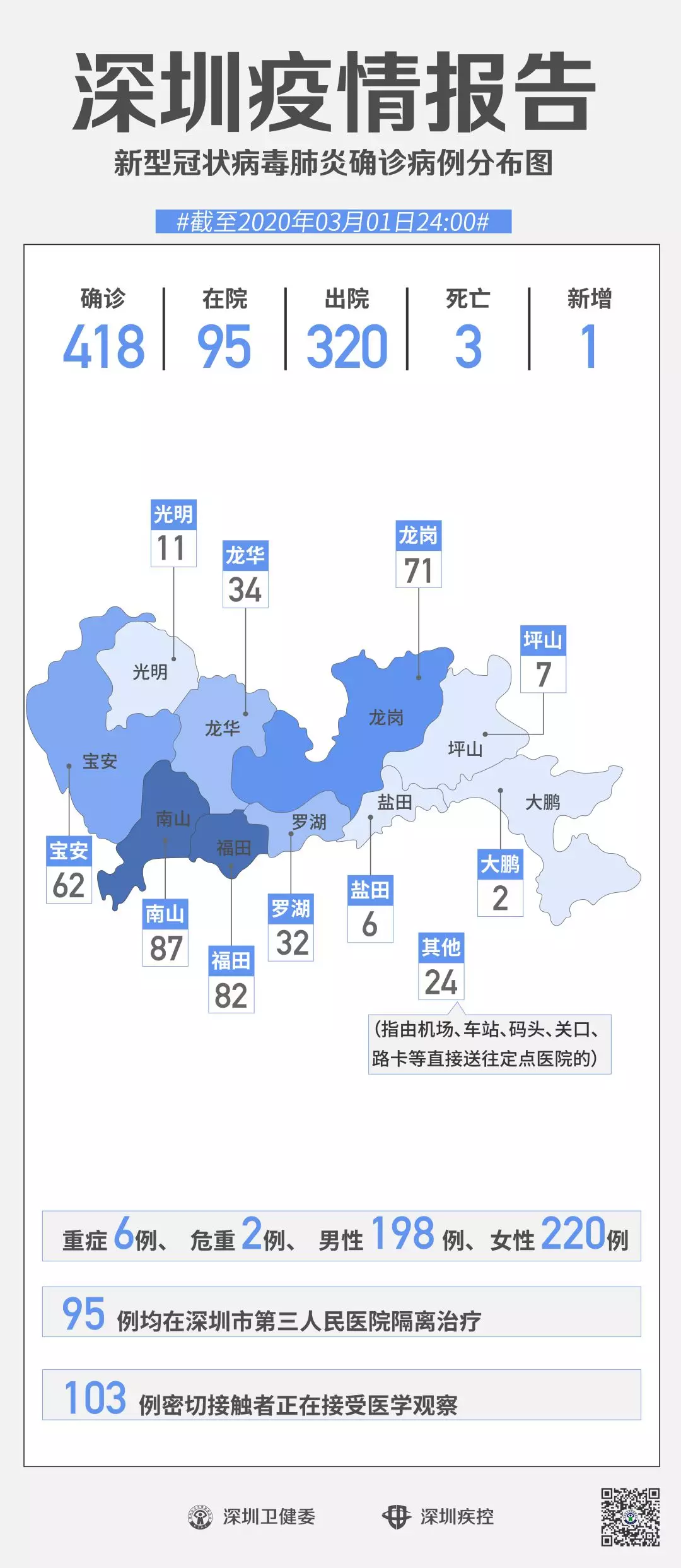 截至3月1日24时,深圳累计报告“新冠肺炎”确诊病例418例。3月1日当天全市新增确诊病例1例,当天出院病例12例(从2月26日起不再公布出院个案)。 ▲新增出院病例已超过新增确诊病例 累计报告确诊病例中,男性198例、女性220例。 按照病例管理地区划分,南山区87例、福田区82例、龙岗区71例、宝安区62例、龙华区34例、罗湖区32例、光明区11例、坪山区7例、盐田区6例、大鹏新区2例、其他(指由机场、车站、码头、关口、路卡等直接送往定点医院的)24例。 目前,重症6例、危重症2例,死亡3例,累计出院320例。 95例确诊病例均在深圳市第三人民医院隔离治疗。 103密切接触者正在接受医学观察。 资料来源:深圳市疾控中心、深圳市卫健委、广东省卫健委