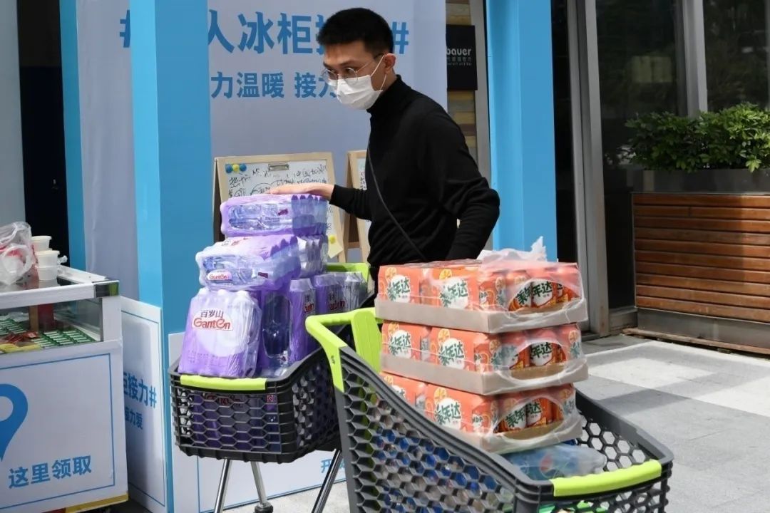 一瓶饮料、一份盒饭、一个口罩,在这个特殊的时期,展示了这个城市的温暖。(新华社记者 赵瑞希 梁旭 摄)