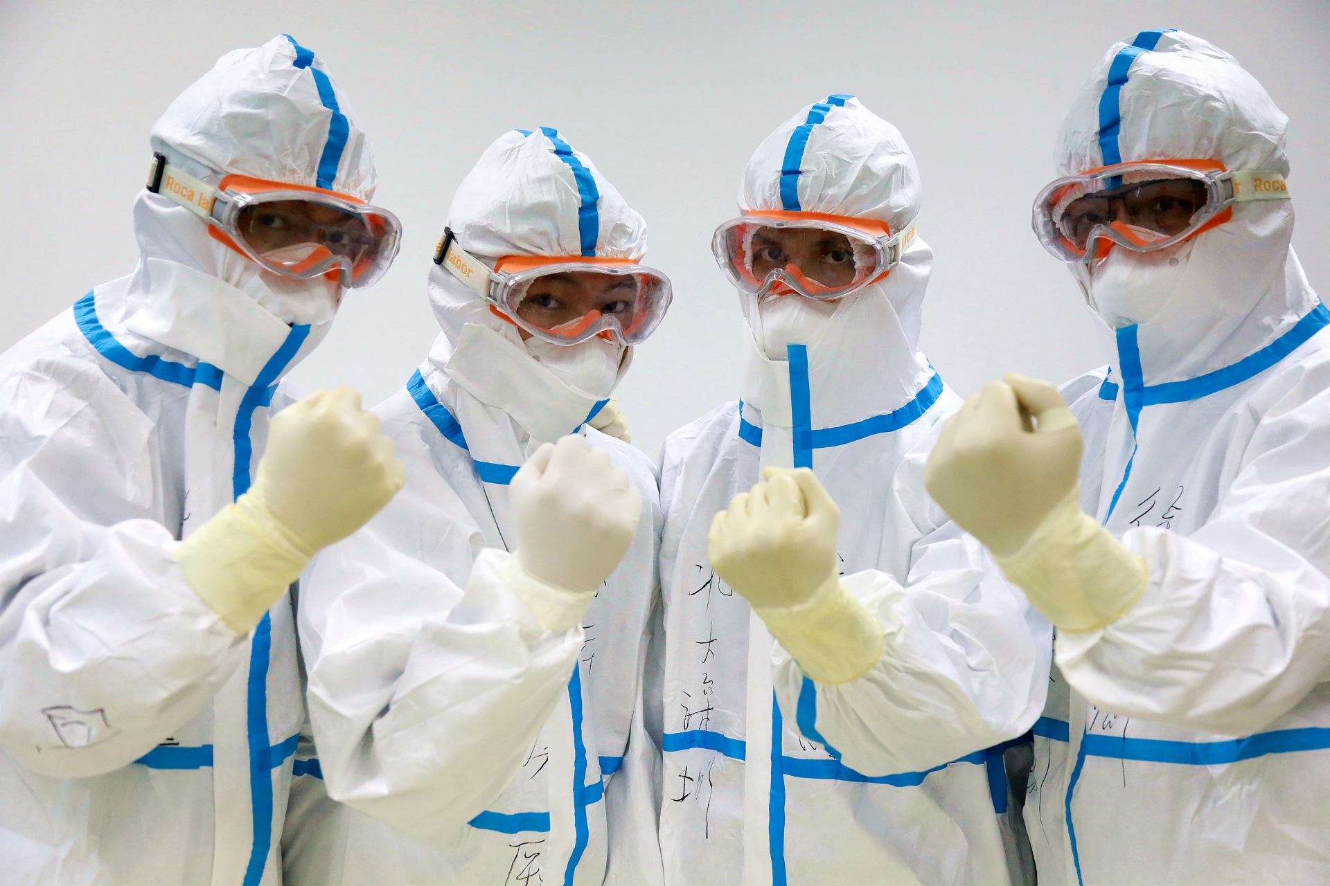 “四小金刚”与珠海中医院重症监护科的战友苏文平(中)在进入战位前合影。