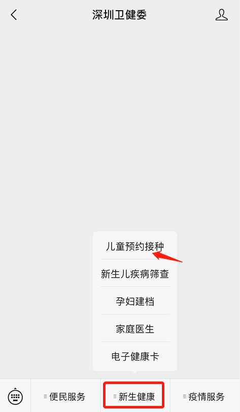 点击公众号菜单栏“新生健康”-“儿童预约接种”