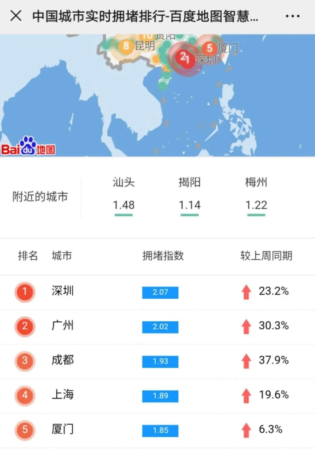 据百度地图提供的中国城市实时拥堵排行来看,3月2日19时许,深圳拥堵指数为2.07,位居全国榜首。