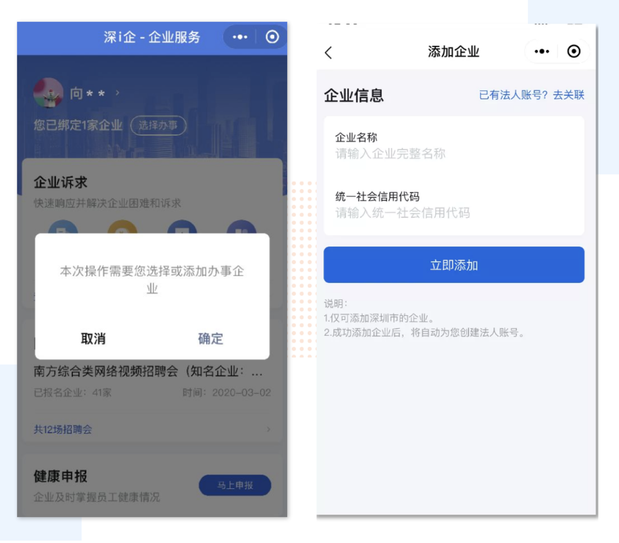 登录后,进入“深i企-精准服务企业”平台主页面,点击“选择办事”。法人或经办人通过输入企业名称和统一社会信用代码添加办事企业,也可以通过已有法人账号关联企业。