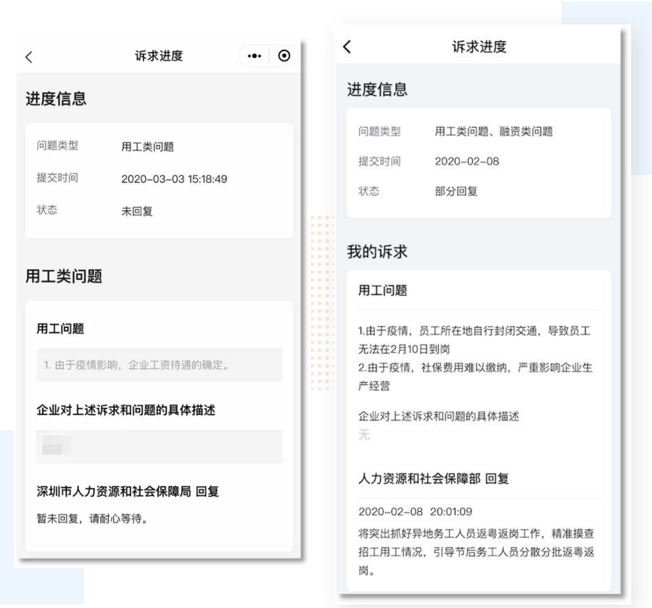 平台于3月3日晚正式上线,截至3月4日下午17时,平台已收到463条诉求(已解决或答复的100条),其中诉求最多的是融资类问题,为172个,占诉求总数近4成;从提交诉求企业的员工规模来看,30人以下企业提出诉求330条;30-100人提出96条。对平台收集的信息,负责的相关工作人员均已第一时间下发至各职能部门研究并提出解决意见。