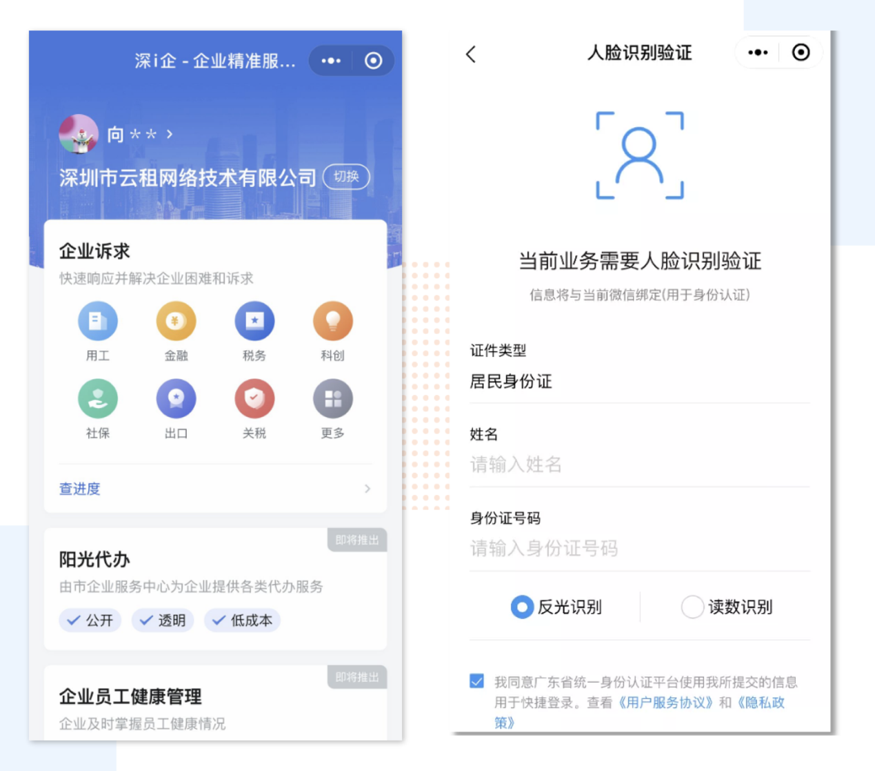 企业法人或经办人进入“深i企-精准服务服务”平台,选择登录,进入实名认证环节。输入姓名和证件号码后,通过人脸识别即可完成实名认证。