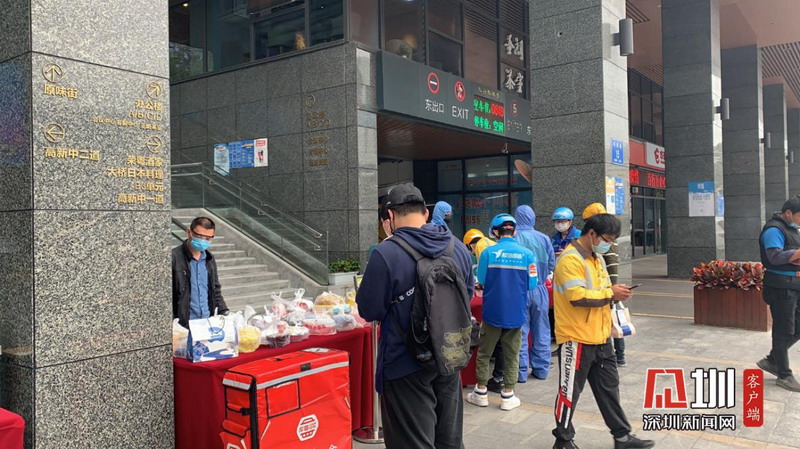 科兴科学园整个园区分为东、西、南、北四个入口,外卖人员只能够将餐品放置在取餐点,园区有专门的工作人员身着防护服对送餐人员进行体温检测和防止人员聚集。