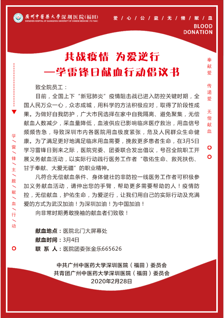 深圳新闻网3月5日讯(见圳客户端、深圳新闻网记者 何静 通讯员 马晓群)受疫情影响,深圳市内的血站频频告急,在这非常时期,为了更好地满足深圳市临床用血需要保障市内血液供应,挽救更多患者生命,恰逢第57个“3.5学雷锋日”到来之际,广州中医药大学深圳医院党委、团委联合发出“共战疫情,为爱逆行”倡议书,号召全院职工开展无偿献血活动。