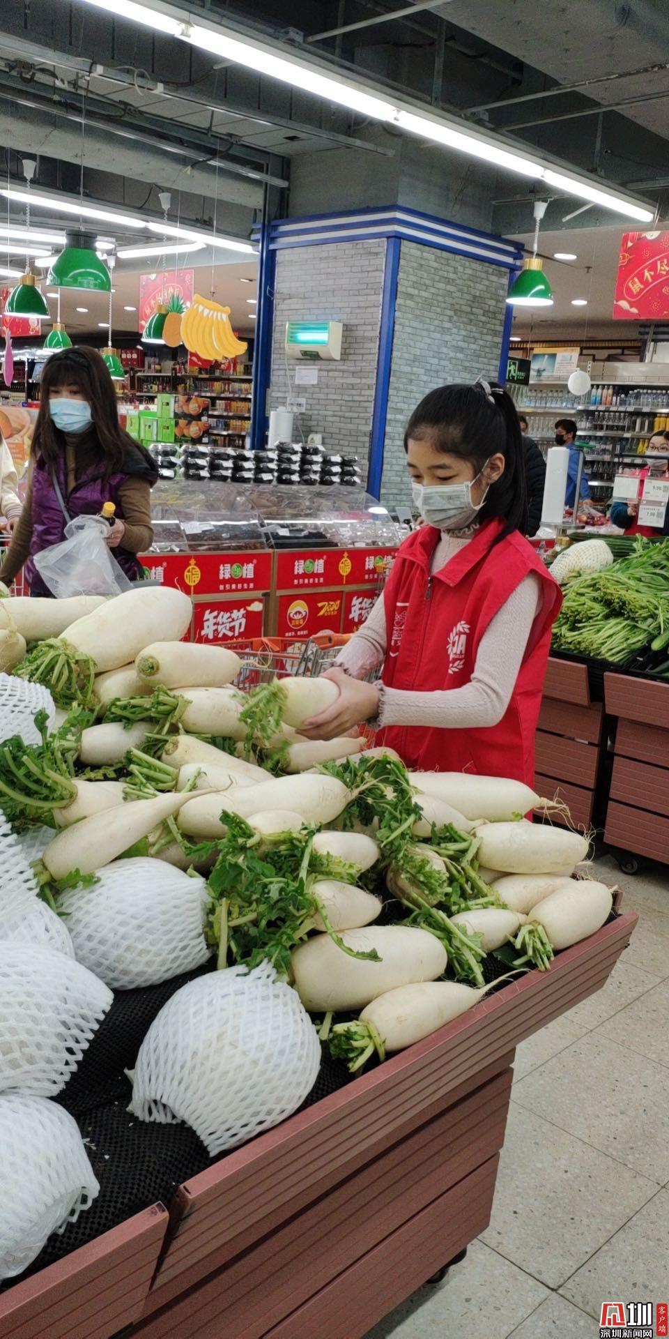 随着疫情发生,春节期间待在深圳的露茜随妈妈投身到了防疫一线,从事食品药品安全志愿服务工作。在商场维持秩序,为市民挑拣蔬菜,成为了顾客眼中“别人家的孩子”。