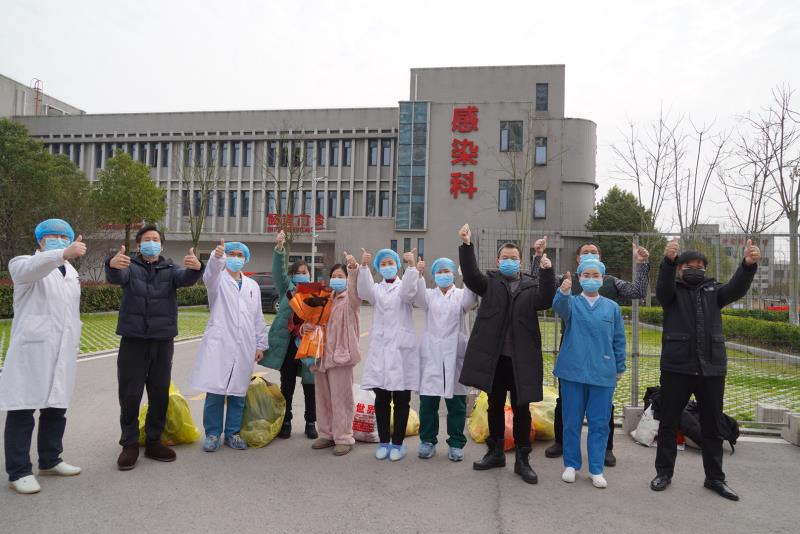 监利县人民医院新冠肺炎患者出院时与医护人员合影留念