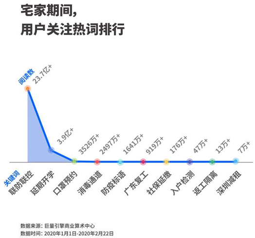 在1月1日至2月22日的头条用户阅读数据中,联防联控、延期开学、口罩预约成为头条平台上最热的关键词前三位。此外、社保延缴、返工隔离等政府措施都被疫情下的手机用户频繁阅读。