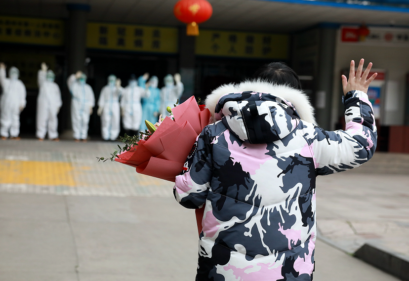 不一会儿,7名穿着防护服的医护人员将张冬雪护送了出来。刚一露面,人群中立刻响起一阵掌声。2位早已在大门外等候的护士激动地上前与张冬雪拥抱,段昌奉也冲上去把饱含大家祝福和关心的鲜花献给她。张冬雪笑着向人群挥手,走了几步后,又回头向依然站在门口目送她的7名医护人员深深鞠了一躬,“谢谢,谢谢你们。”