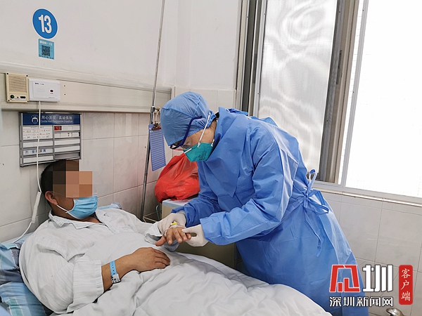 刚刚看到检测结果,邝医生便迅速穿上防护服,进入隔离区跟患者进行了面对面的沟通交流。那位患者得知自己检测的结果后略显失落,叹了一口气,似乎是担心焦虑等待了多日,心里的石头终于落了地。他说:“我一定听您的话,好好吃药,好好治疗,争取活着回来。”