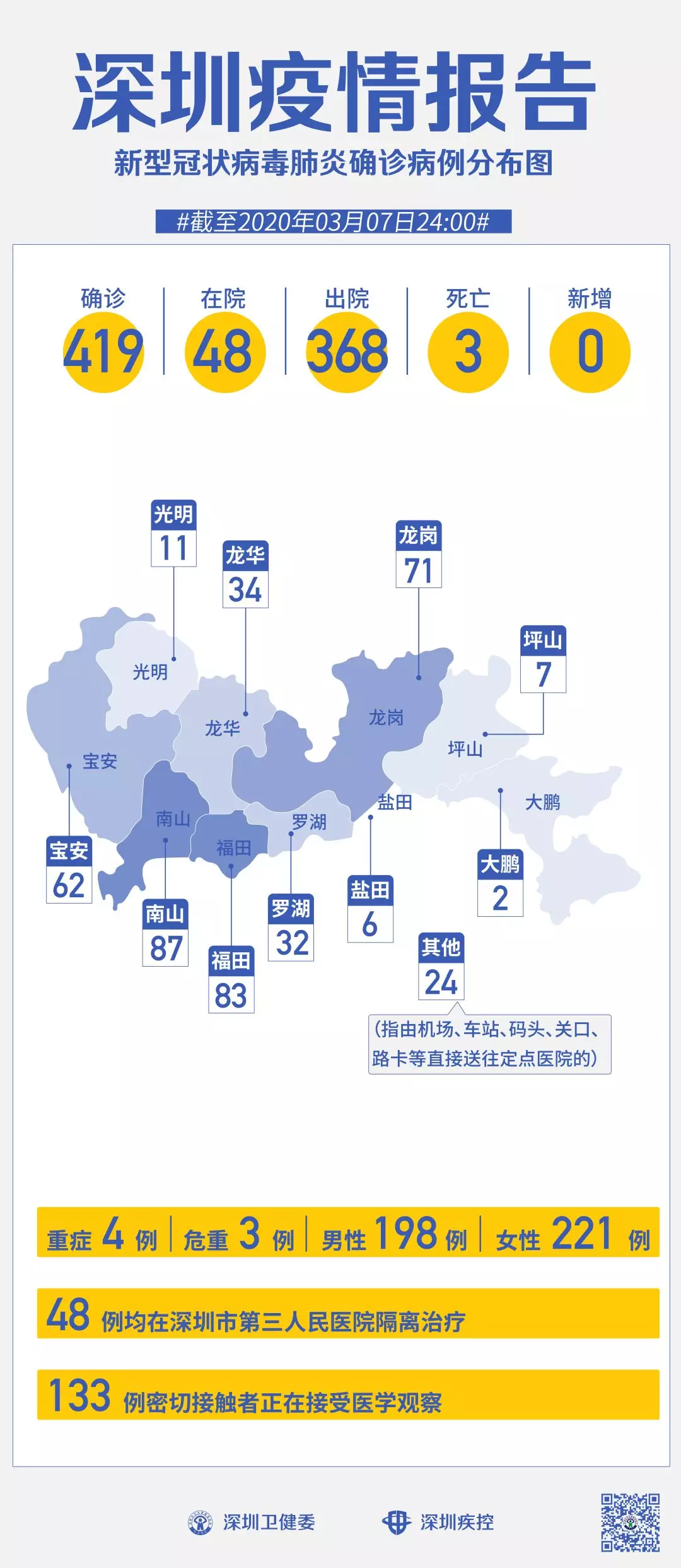 截至3月7日24时,深圳累计报告“新冠肺炎”确诊病例419例。3月7日当天全市无新增确诊病例,当天出院病例7例(从2月26日起不再公布出院个案)。
