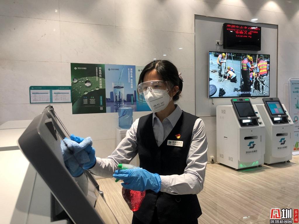 福田分公司福田营业厅杨丽娜,正对自动服务机进行消毒。