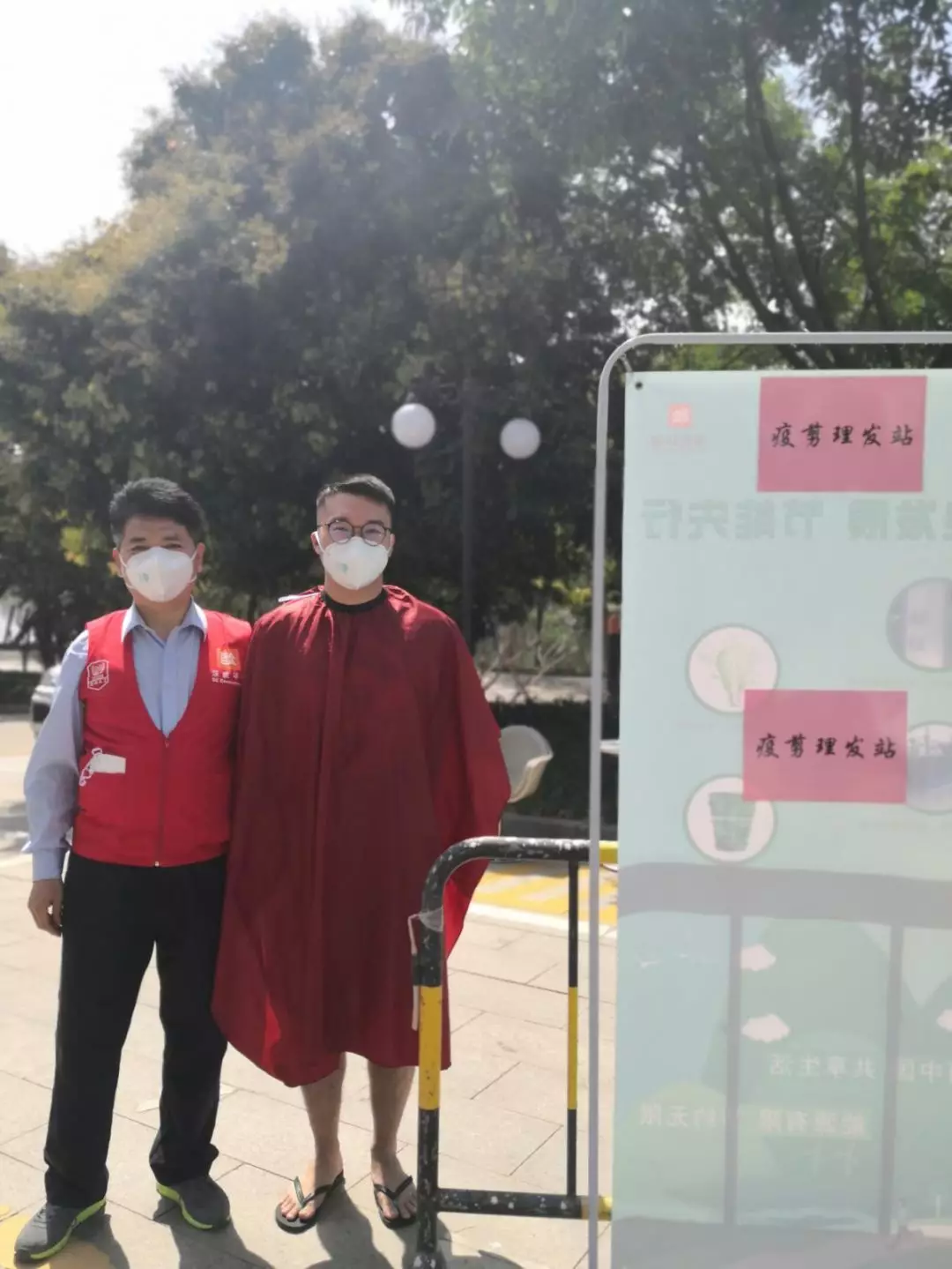 公司本部,1303会议室,临时理发室“生意”也火爆极了。公司工会邀请了两名专业的Tony老师,为近90名员工提供免费的理发服务。为减少人员聚集,理发采取提前线上预约,分时段进行,确保安全的同时,尽可能让有需要的同事都能理上发。铺上一次性地毯,坐上椅子,围上一次性“斗篷”,Tony老师一顿熟练的剪发操作后,再用吹风机整好造型,就完成了理发的全过程。临时理发师的搭建,有效解决了员工生活上的困难,帮助他们以良好的精神面貌投入工作来。