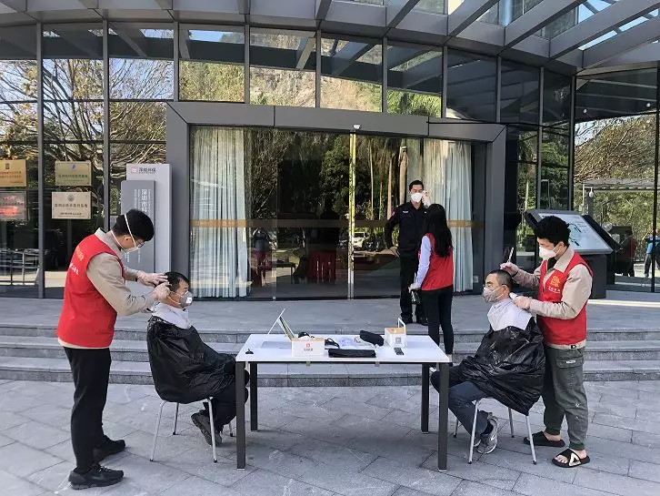 二月二,龙抬头,一把椅子、一面镜子、一套剃发工具,盐田能源生态园的简易理发室开张啦。防疫先锋战斗队五人义剪小分队随即开始行动,对理发室开启自然通风,对理发用具进行消毒,清洁双手,全部使用一次性“斗篷”,确保理发过程中一“客”一换一消毒……准备工作做好后,Tony老师开启微信排号,统一戴上口罩,测量体温登记后,提拉剪推,一气呵成。本次义剪为30余名员工解决了“头”大事,大家“轻装上阵”,将以更饱满的精神投入到疫情防控和安全生产工作中。