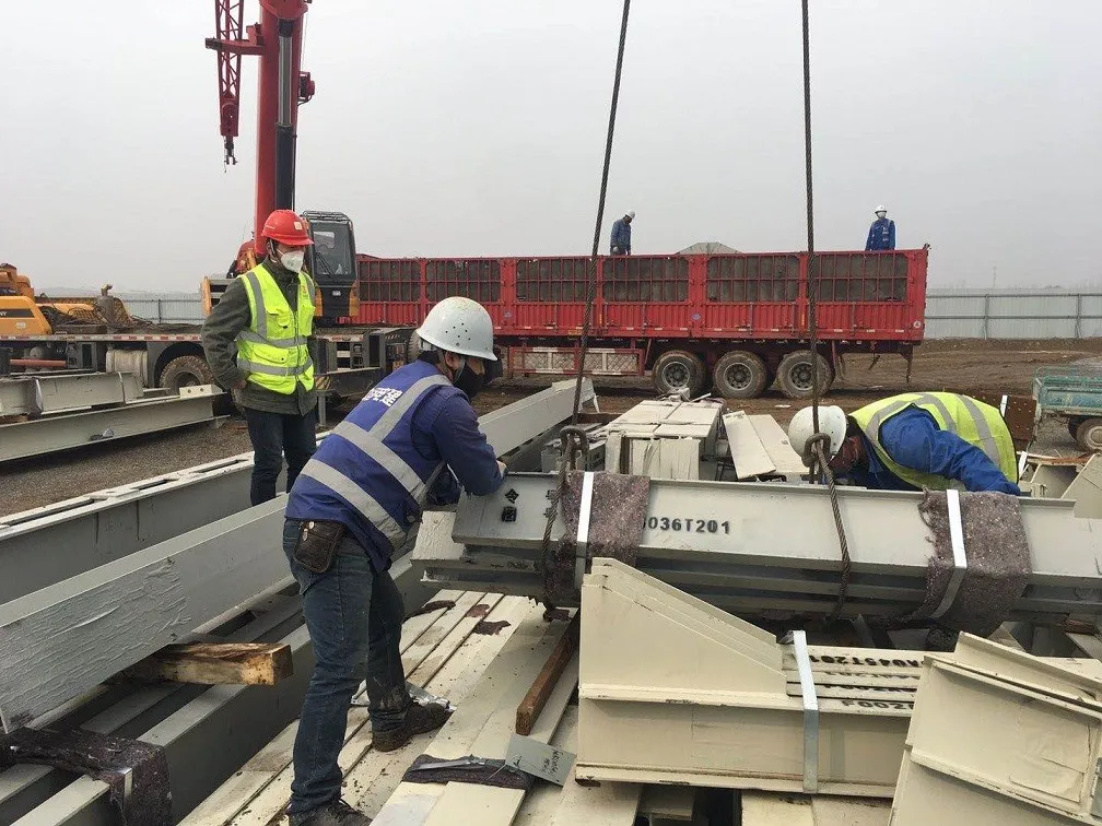 任丘能源生态园复工后首车钢结构到现场,相关人员正在有序清点、卸车、堆放,为下一步安装工程夯实基础。