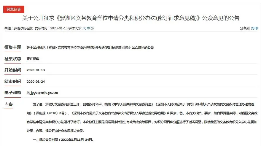 罗湖区在1月13日发布了《罗湖区义务教育学位申请分类和积分办法(修订征求意见稿)》向市民征求意见。
