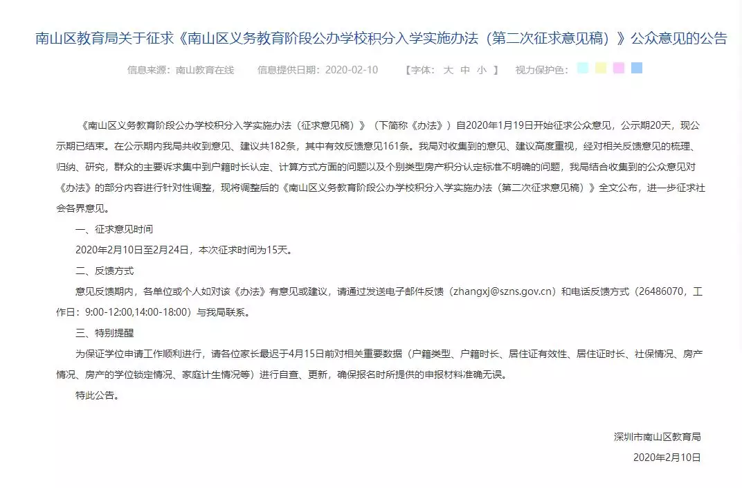 1月19日,南山区教育局第一次征求意见发出后,共收集到关于积分算法调整的反馈意见182条,并于2月10日第二次发布《南山区义务教育阶段公布学校积分入学实施办法》征求意见稿(以下简称《意见》),根据《意见》内容,拟调整2020年积分入学办法。