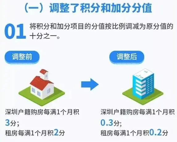 (1)深圳户籍购房从每满1个月积3分,调整为积0.3分;租房从每满1个月积2分,调整为0.2分。