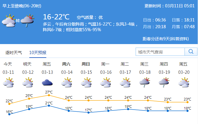 见圳客户端·深圳新闻网2020年3月11日讯 据市气象台消息,今日深圳多云,午后有分散阵雨;气温16-22℃;东风3-4级,阵风6-7级;相对湿度55%-95%。