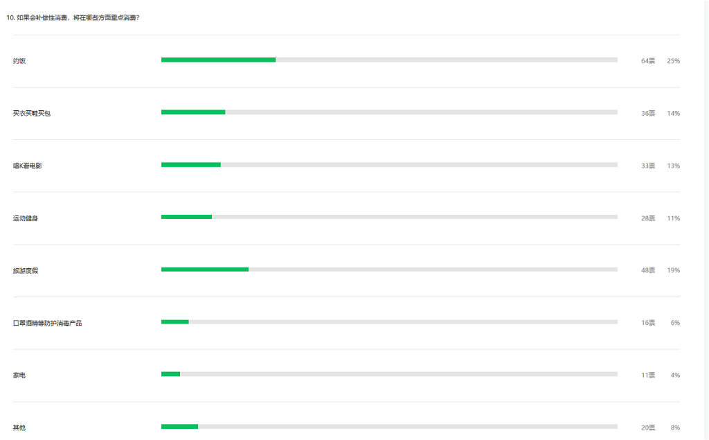 整体看,疫情对深圳市民总体消费意愿有影响。调查显示,近四成受访者表示疫情结束后会有补偿性消费,约饭、旅游度假、买衣买鞋买包、唱K看电影以及运动健身成为疫情过后补偿性消费的五大主要领域。