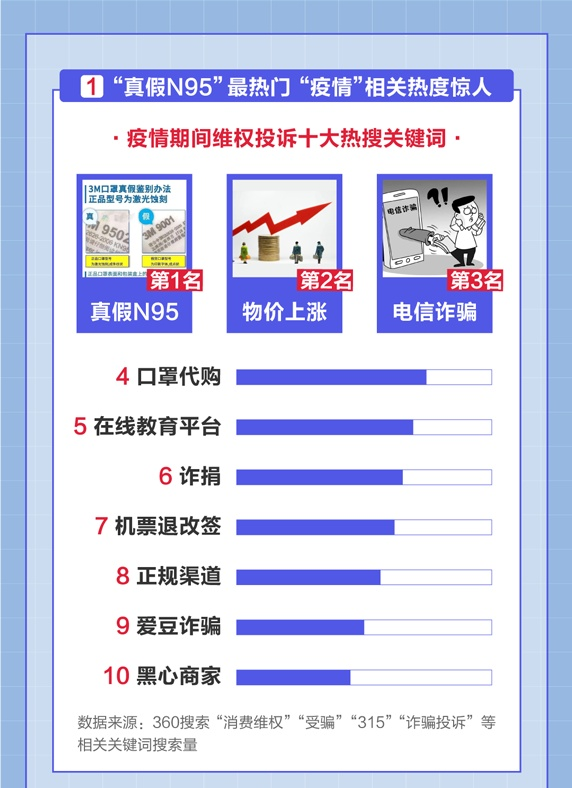 深圳商报2020年3月15日讯 360搜索、360浏览器今日发布《315消费者维权数据报告》(以下简称《报告》)。报告显示,“真假N95”、“口罩代购”等与口罩质量相关的讯息成热议话题。