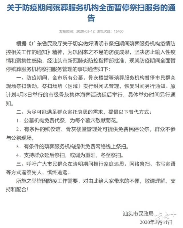 汕头全市所有公墓、骨灰楼堂等殡葬服务机构暂停市民群众现场祭扫活动,祭扫场所(区域)实行封闭式管理,并提倡以下替代方式:公墓机构免费代祭,为每个墓穴敬献菊花;有条件的殡仪馆、骨灰楼堂管理处可提供免费民俗公祭,群众不参与公祭现场;有条件的殡葬服务机构提供免费网络线上祭扫;支持群众延后祭扫,或调为重阳、冬至祭扫。