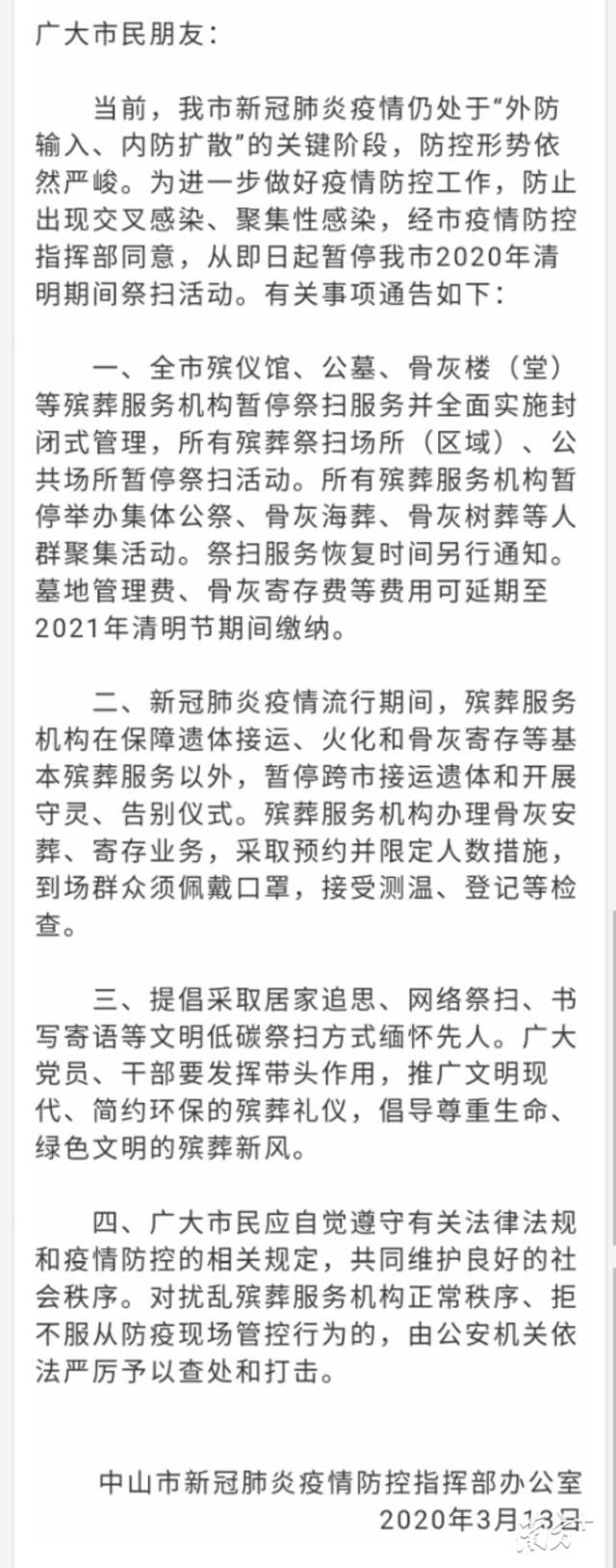 中山全市所有殡葬祭扫场所(区域)、公共场所暂停祭扫活动。殡葬服务机构办理骨灰安葬、寄存业务,采取预约并限定人数措施。