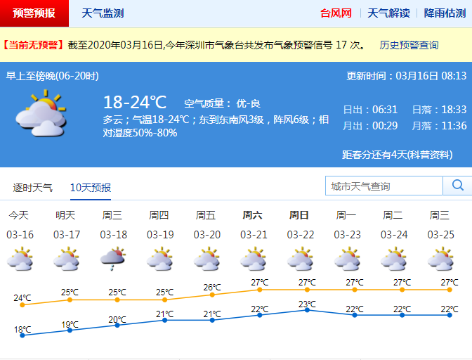 见圳客户端·深圳新闻网2020年3月16日讯 刚刚过去的周末,鹏城天气温暖湿润,以多云为主。早晨最低气温17℃-19℃,白天最高气温23℃-24℃。市气象台预测,本周天气温暖湿润,部分时间有阵雨。