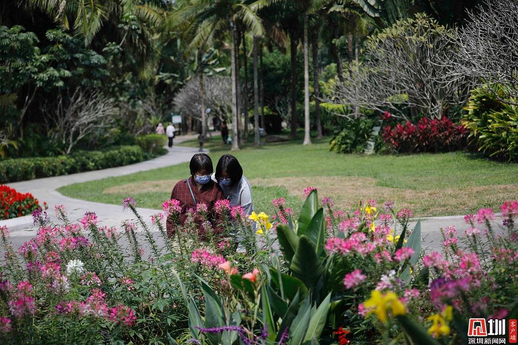 两位市民正在观赏鲜花。